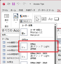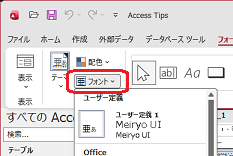 フォームのコントロールで使われるフォントの種類を変更するには、ひとつずつフォームのデザインビューを開いて、個々に、あるいは全コントロールを選択して設定していく方法もありますが、データベース内のフォントを一括して変更する方法もあります。